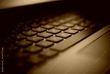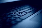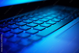 Close up image of laptop keyboard in dark neon light.