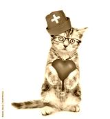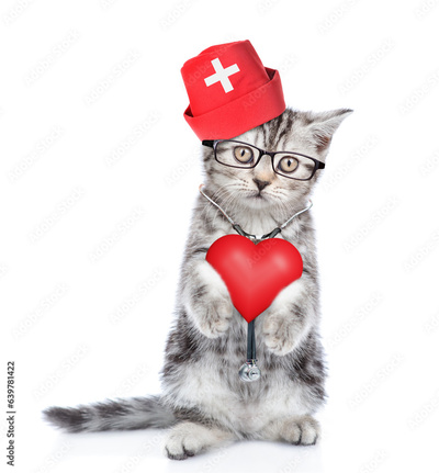Smart kitten wearing like a doctor with stethoscope on his neck standing on hind legs and holds red heart. isolated on white background