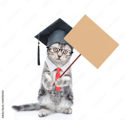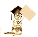 Graduated cat stands on hind legs and shows empty placard. Back to school concept. isolated on white background