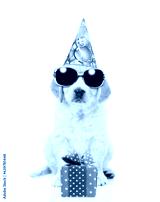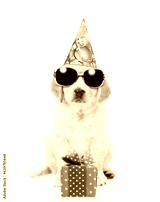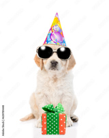 Golden retriever puppy wearing sunglasses and party cap sits with gift box. isolated on white background
