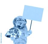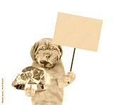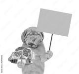 Licking lips Mastiff puppy holds bowl of raw meat and shows empty placard. isolated on white background