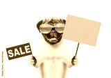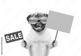 Pug puppy wearing mirrored sunglasses showing signboard with labeled "sale" and empty placard. isolated on white background