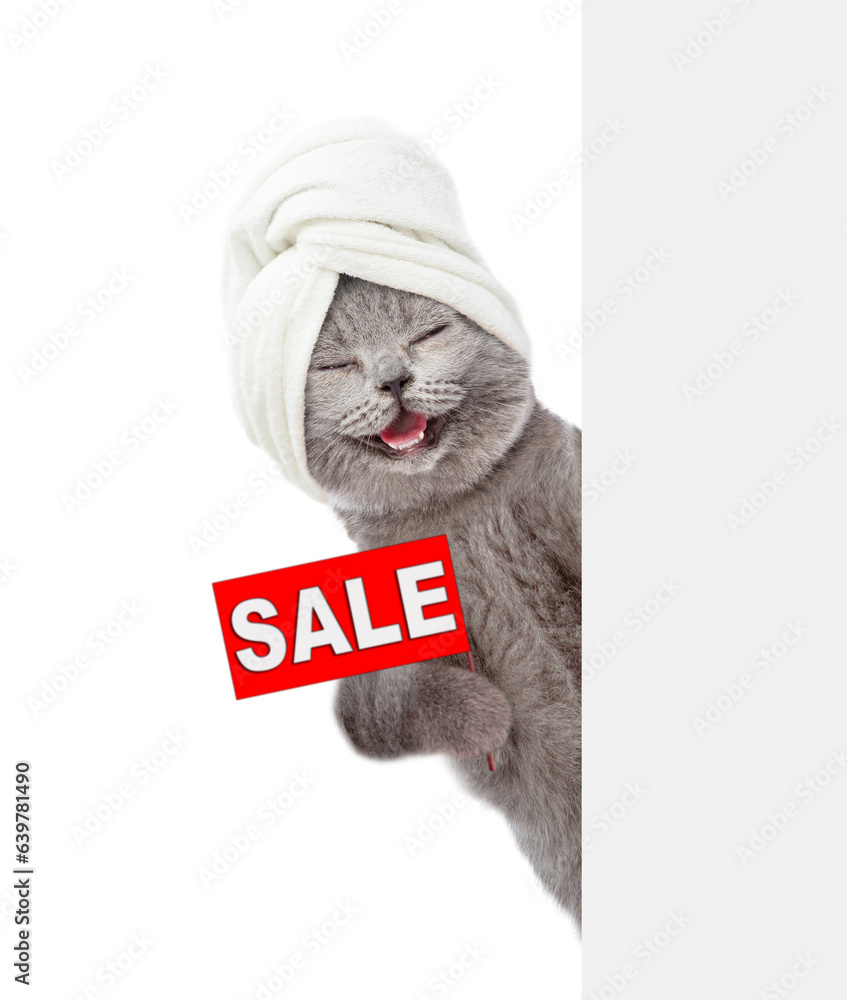 Happy cat with towel on it head shows signboard with labeled "sale" behind empty white banner. isolated on white background