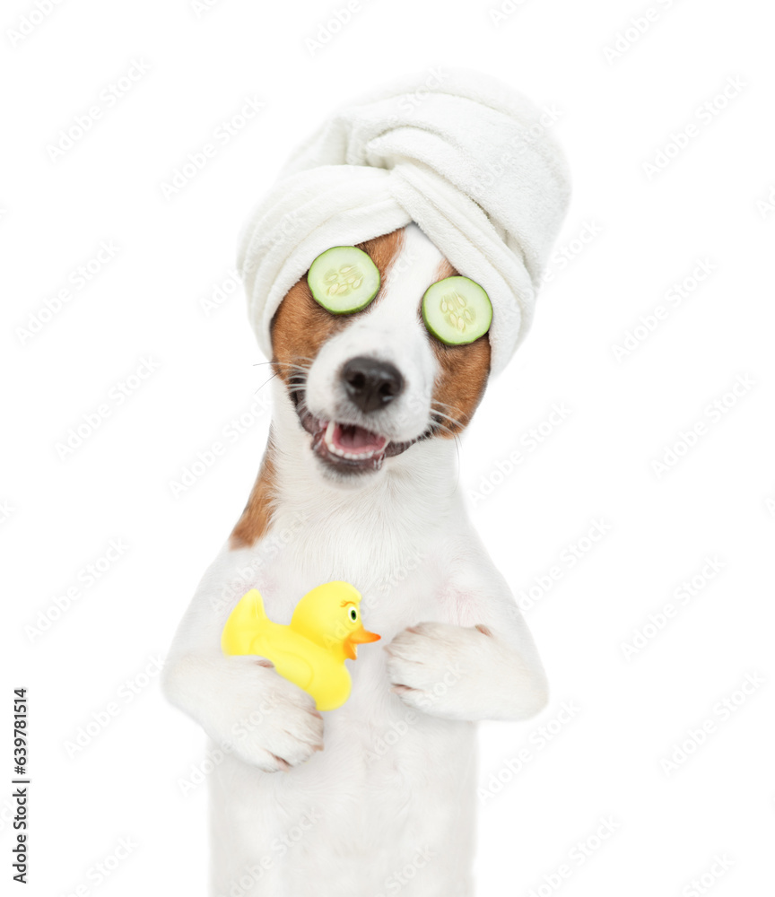 Funny jack russell terrier puppy with towel on it head and with a piece of cucumber on it eyes holding rubber duck. Isolated on white background