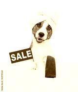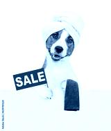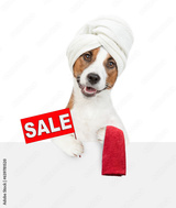 Funny Jack russell terrier puppy with towel on it head shows sales symbol above empty white banner. isolated on white background