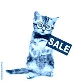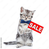 Smart kitten wearing eyeglasses and tie bow standing on hind legs and holds signboard with labeled "sale". isolated on white background