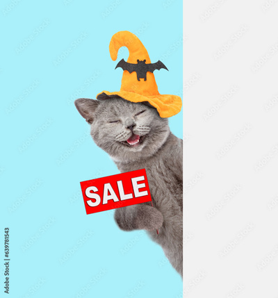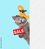 Happy cat wearing hat for halloween looks from behind empty white banner and shows signboard with labeled "sale". Isolated on blue background
