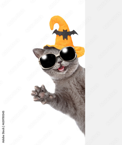 Happy cat wearing hat for halloween looks from behind empty white banner. isolated on white background