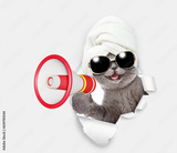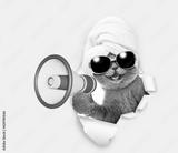 Happy cat puppy with towel on it head screaming into a megaphone and looking through a hole in white paper