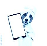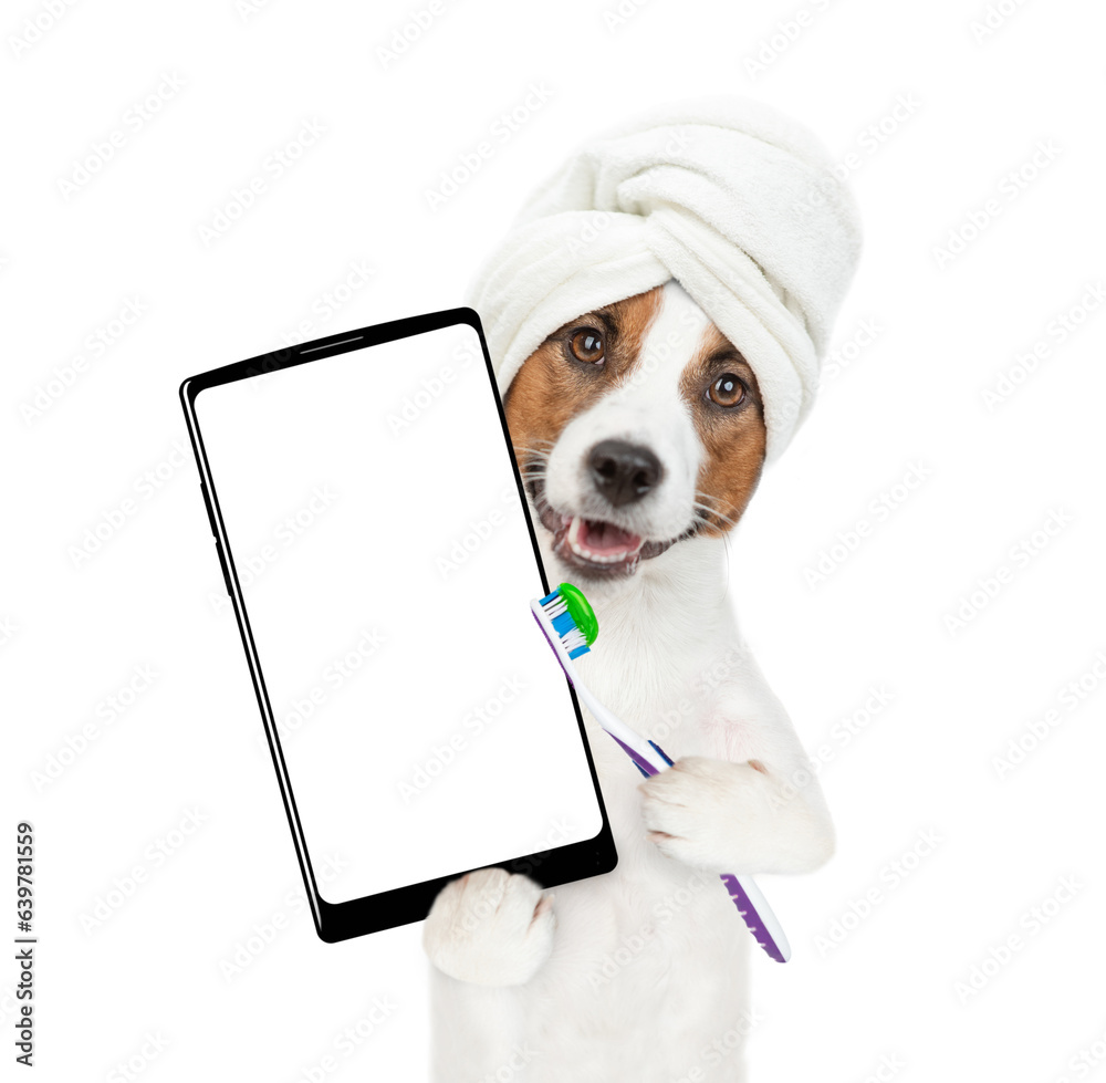 Funny Jack Russell terrier puppy with towel on it head holds toothbrush and holds big smartphone with white blank screen in it paw. isolated on white background