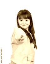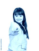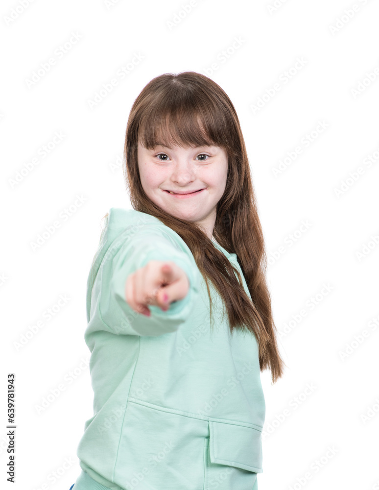 Happy young girl with Downs syndrom points on you. Isolated on white background