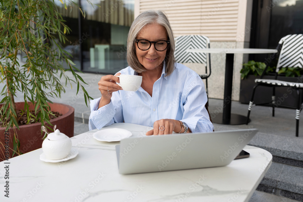 60 year old pretty caucasian business lady dressed in a shirt drinking coffee on the terrace during a break