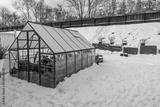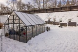 Gorgeous winter view of small garden and greenhouse with collected things for winter. Gardening concept. Sweden.