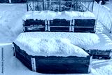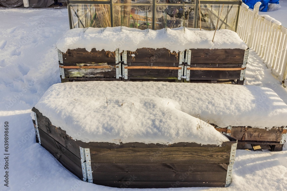 Close-up view of snow-covered strawberry bushes growing in pallet collars in winter garden. Sweden.