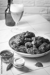 Buffalo style chicken wings served with cold beer on white background