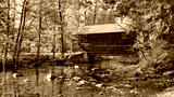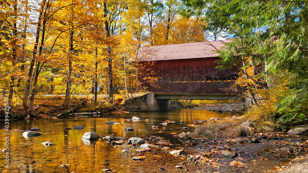 Red, wooden, covered bridge with beautiful autumn colors and river reflections, Stowe, Vermont, USA