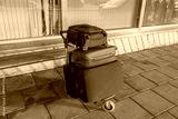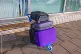 Close-up view of suitcases on trolley near airport entrance. Concept of tourism and transport. Sweden.