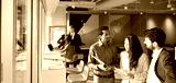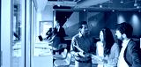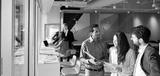 Young happy professional international team business people workers standing in corporate office, diverse colleagues discussing work having teamwork conversation together at meeting.
