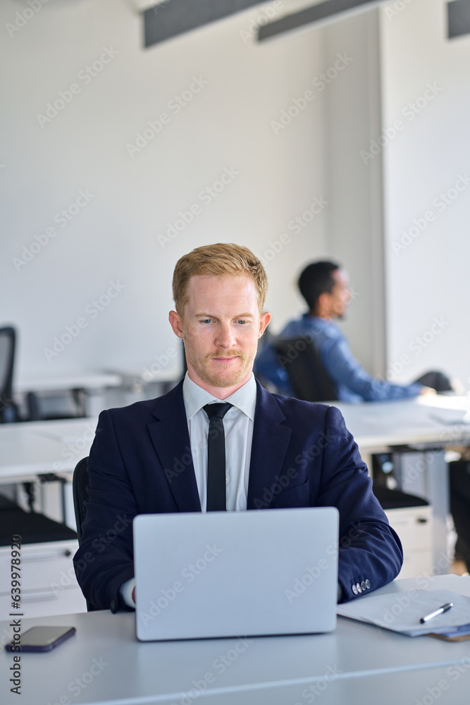 Busy business man manager employee wearing suit using laptop in office. Male professional employee executive working on financial investment market digital analysis sitting at desk. Vertical