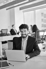 Confident happy young Latin business man worker sitting at office work with laptop looking at camera. Smiling businessman employee at workplace in modern coworking, vertical portrait.