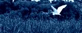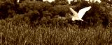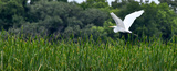 White egret fishing along the water shore