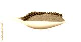 Fresh green pepper, piper nigrum, spice falling in pepper ground on white background