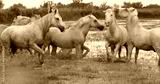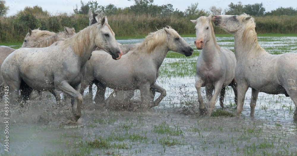 Camargue Horse, Herd standing in Swamp, Saintes Marie de la Mer in Camargue, in the South of France