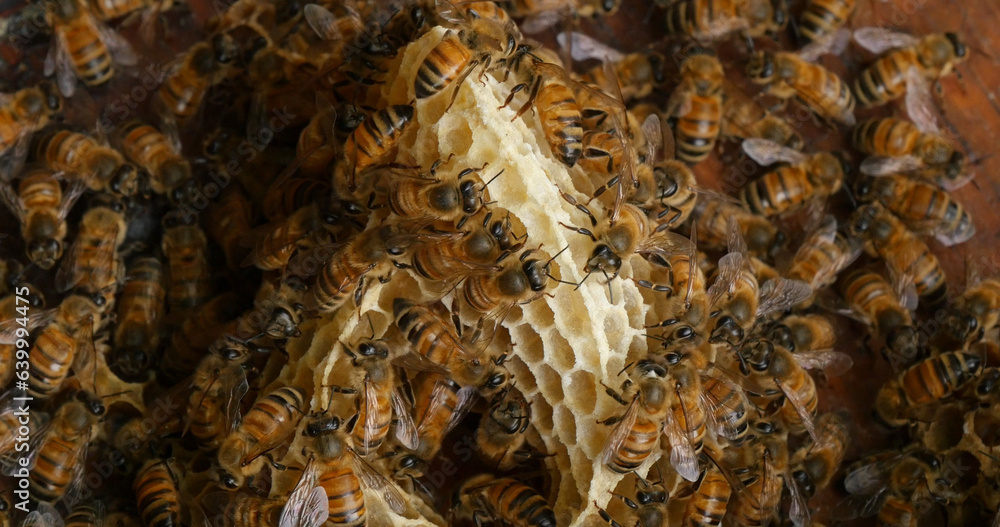 |European Honey Bee, apis mellifera, Bees on a wild Ray, Bees working on Alveolus, Wild Bee Hive in Normandy