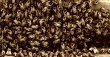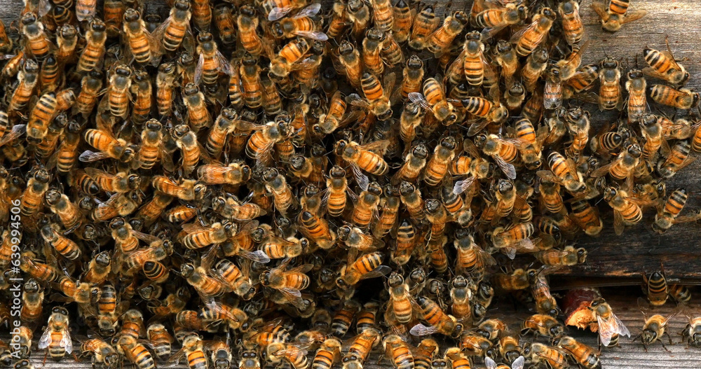 |European Honey Bee, apis mellifera, bees grazing on the hive entrance, Bee Hive in Normandy
