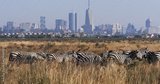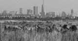Grant's Zebra, equus burchelli boehmi, Herd at Nairobi Park in Kenya, Nairobi city in the back