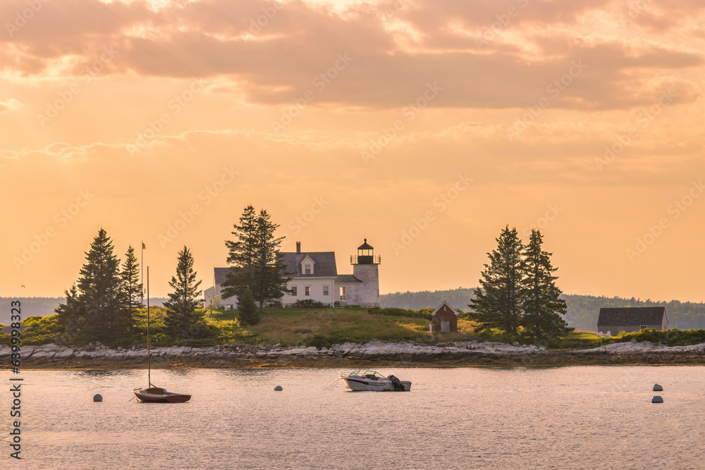 Pumpkin Island lighthouse in Stonington, Maine at sunset