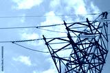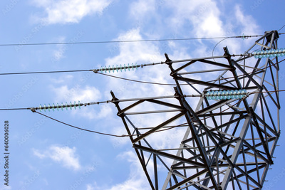 High voltage tower with electrical voltage wires isolates close-up against the background of clouds. Energy industry.