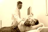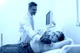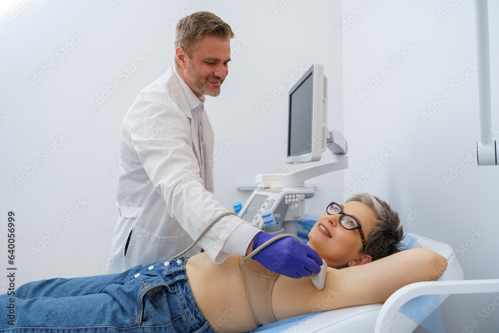 Mature woman has ultrasound lymph nodes in area under the armpits in clinic. High quality photo