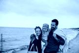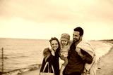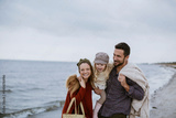 Young caucasian family spending time and walking on a beach during winter and colder weather