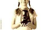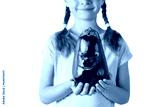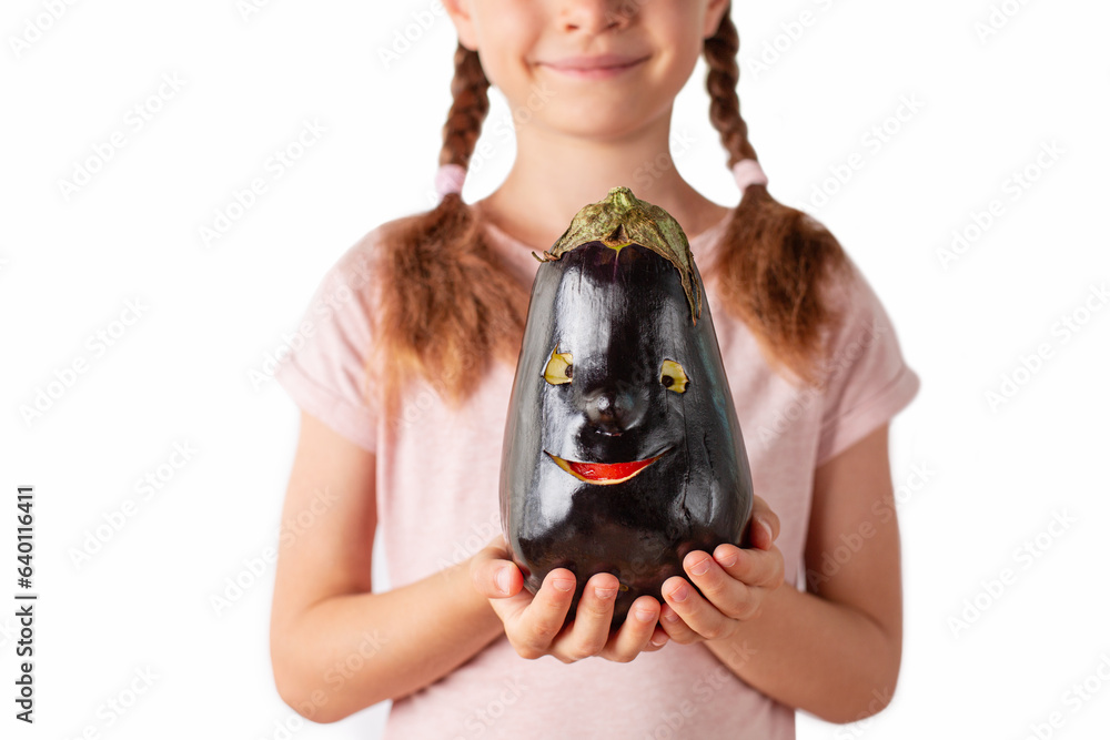 Happy little girl holding creative animated eggplant with cutted smiling face. Concept of fun activity with children. No visible face.