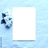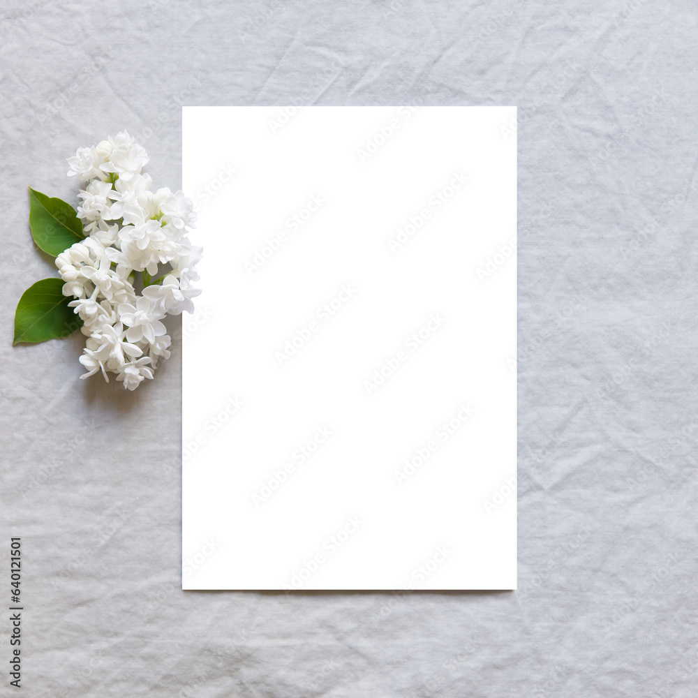 Happy birthday, mother's day, wedding composition. Blank greeting card, invitation and envelope mockup. Rectangular blank with delicate lilac flowers. Flat lay, top view. square.