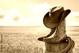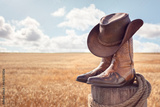Cowboy hat, boots and wheat field background at ranch stables, country music festival live concert or line dancing concept