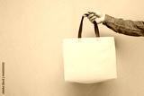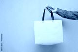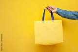 empty fabric eco bag on a yellow background, the guy's hand holds a reusable non-plastic bag