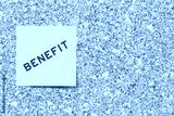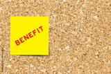 Yellow note paper with word benefit on cork board background with copy space