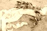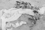 Mediterranean wedding still life. Olive tree branches, fruit with silk ribbons and white muslin table runner, cloth or veil. Grunge concrete background, floor. Summer holiday design. Selective focus.