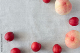 Gray fabric background with fruit frame lined with red plums and pink peaches