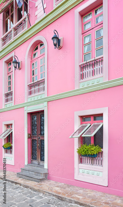 Street view of a colonial building facade, Guayaquil, Ecuador.