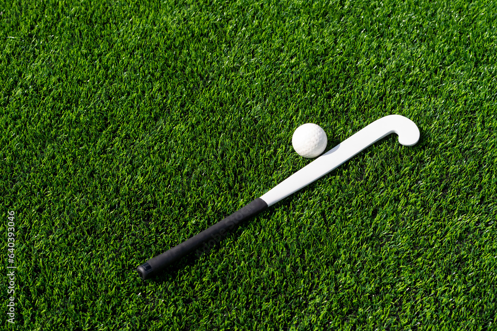 Field hockey stick and ball on green grass. Team sport concept. Horizontal sport theme poster, greeting cards, headers, website and app