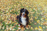 A happy Bernese Mountain Dog sitting in fall leaves, smiling up at the camera