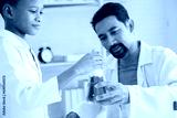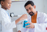 Curiosity African Asian primary school boy student wearing lab coats happy studying with chemical teacher analyzing substance liquid test in laboratory room, lifestyle learning education science class