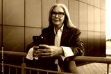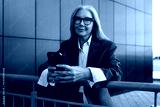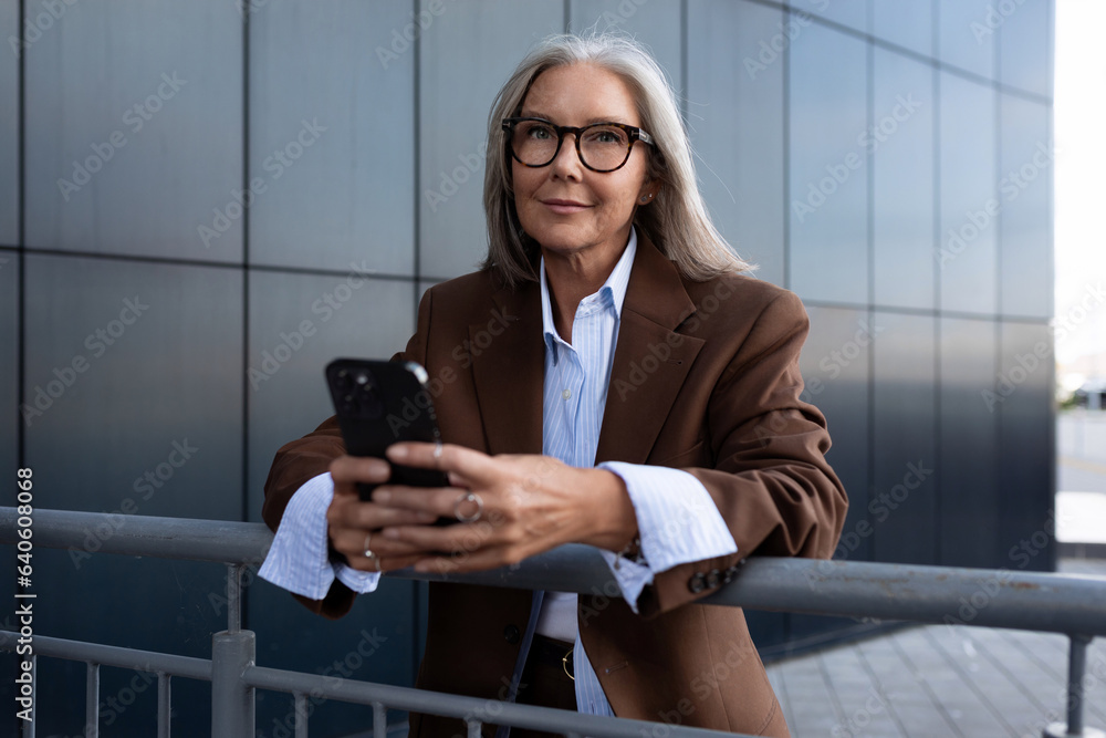 confident 60-year-old gray-haired business woman with a bob hairstyle is dressed in a brown jacket and trousers against the backdrop of a building