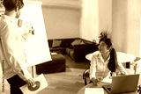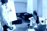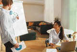 Male manager present his project plan to female ceo during meeting in office. High quality photo