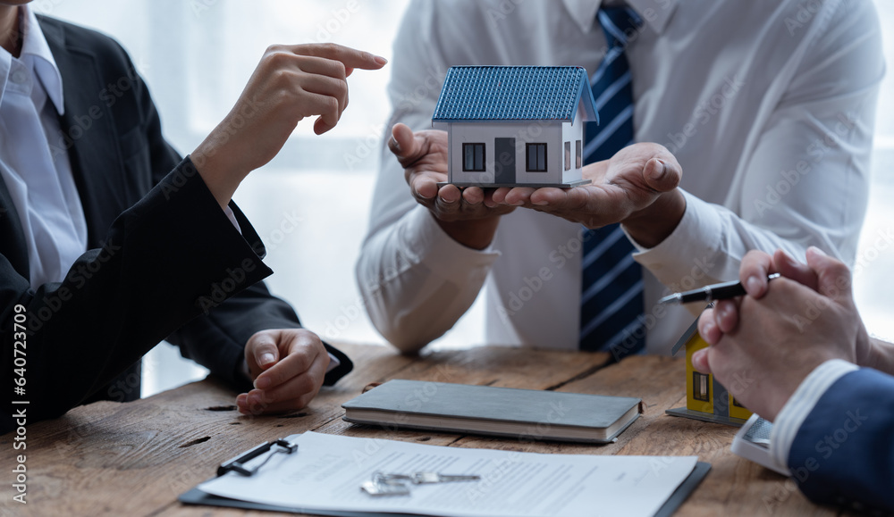 The lawyer sitting at desk with scales of justice, gavel and small wooden house, working with documents, signing contract agreements. Real estate law, foreclosed property, lawyer services concept
