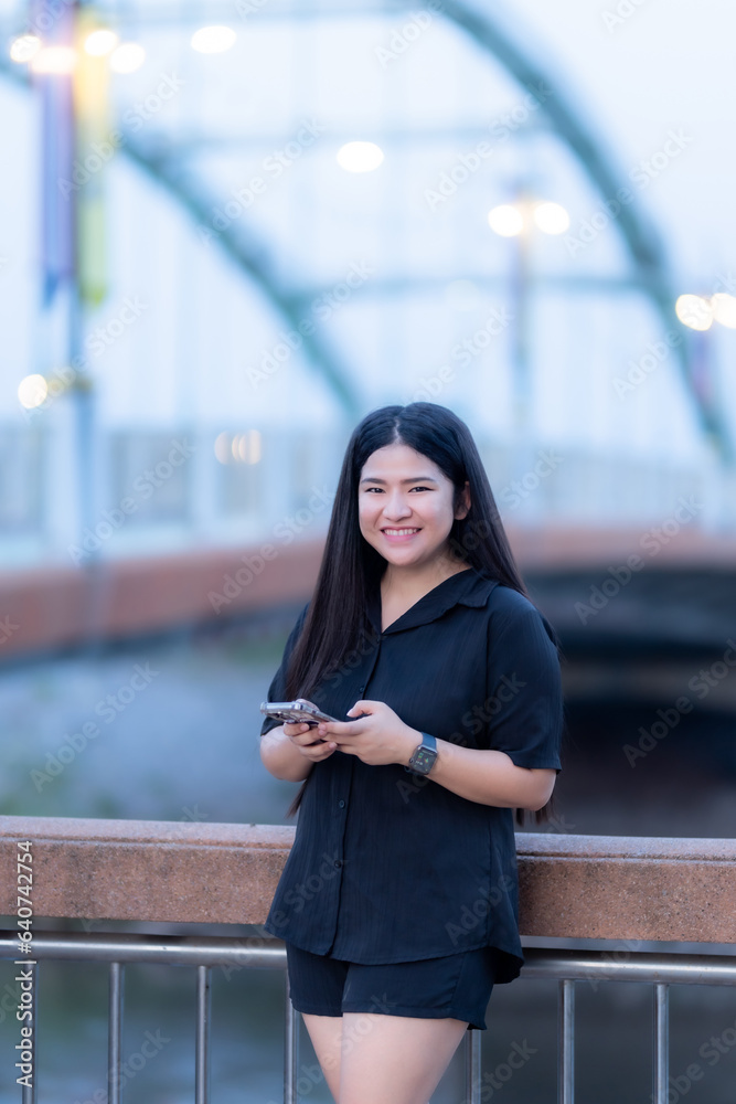 Portrait asian woman tourist in black shirt dress with a smartphone on Route walking jogging or ride bicycle and exercise on the bridge.