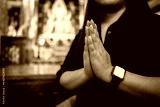 Close-up asian woman tourist Pay respect hand wearing smartwatch with faith to Buddha statue in temple thailand belief in Buddhism